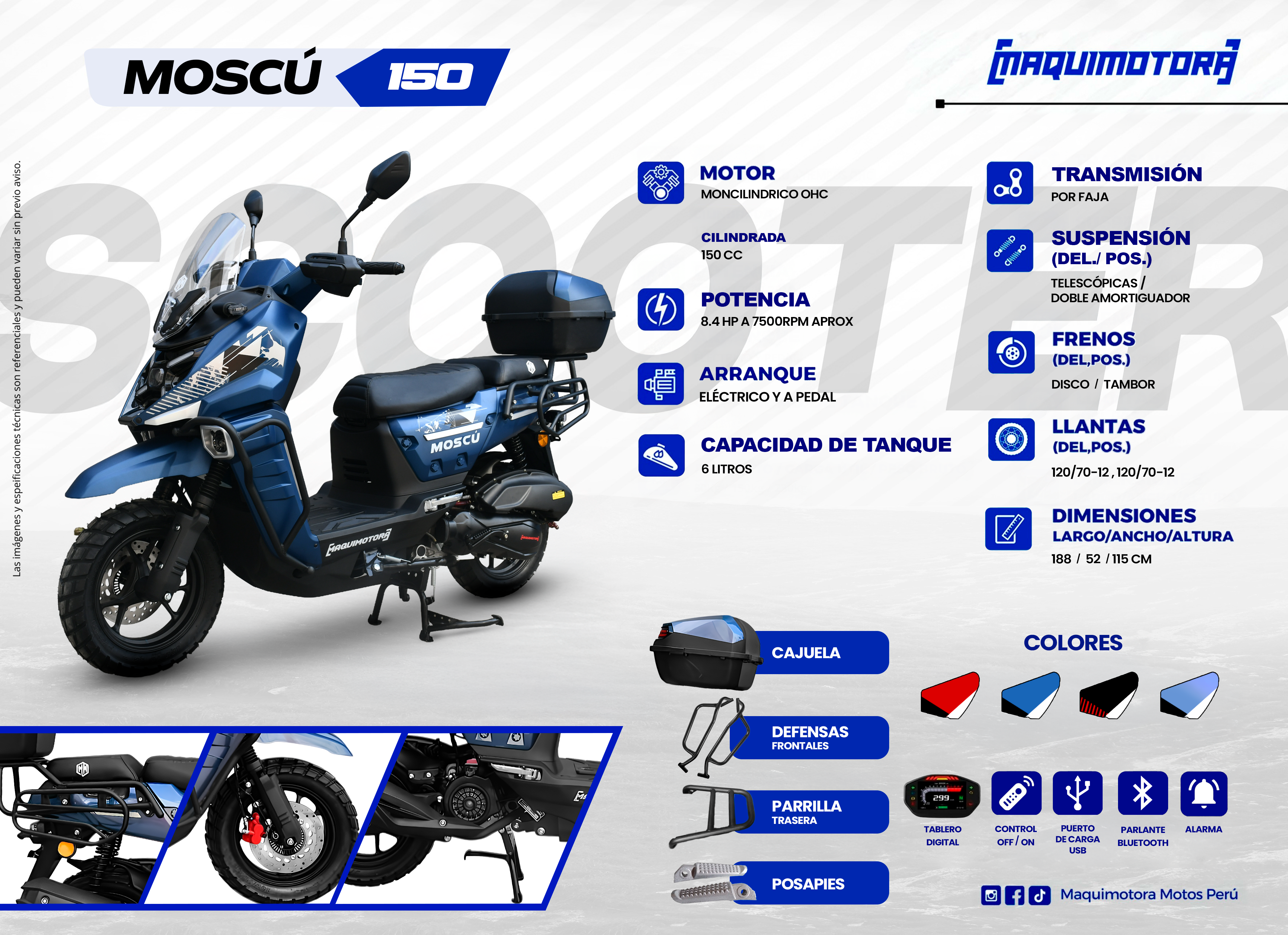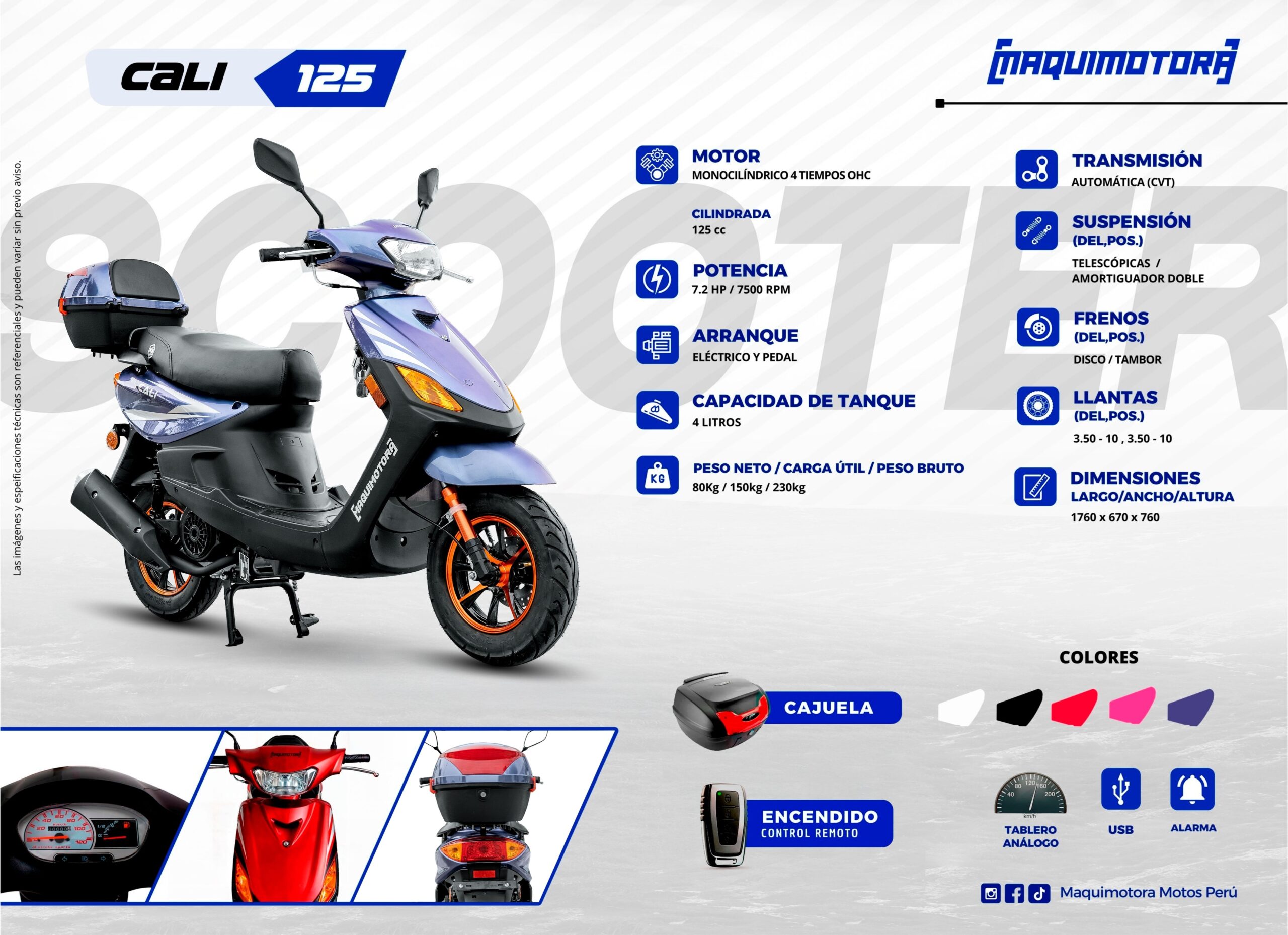 | Extras | Bluetooth/MP3, Cajuela, Iluminacion Led, Porta Alforja, Puerto de Carga USB |